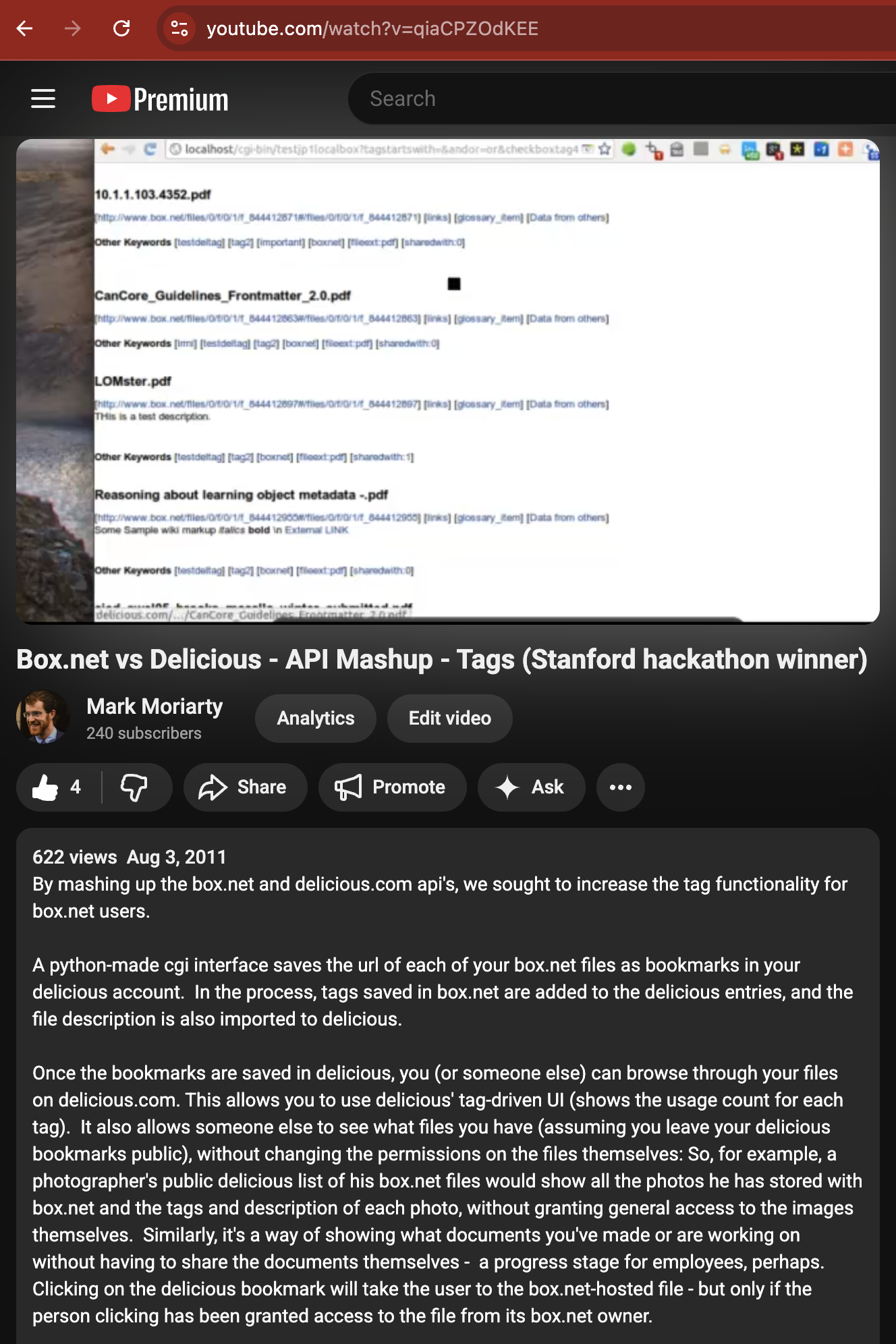Built a Python CGI application that bridges the Box.net and Delicious.com APIs to unlock powerful tag-driven file discovery and access control. The tool automatically syncs Box.net file metadata — URLs, tags, and descriptions — as Delicious bookmarks, enabling users to leverage Delicious’s rich tagging UI (usage counts, social tagging, public browse-ability) without altering underlying file permissions on Box.net. This creates a lightweight discovery layer: colleagues or collaborators can browse file titles, descriptions, and tags — and click through to access only what they’ve been explicitly granted. The interface also extends Delicious’s native search with