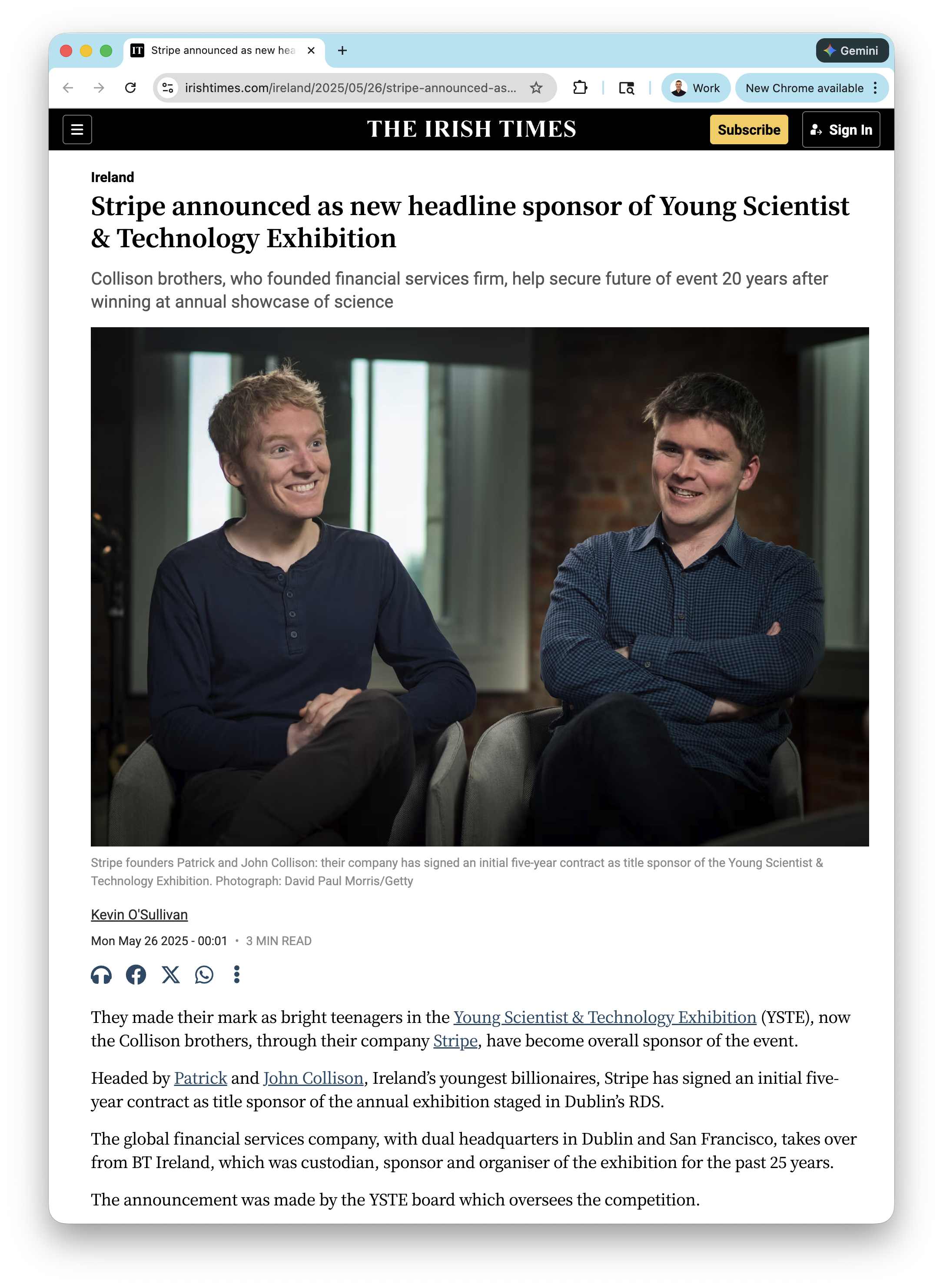Patrick Collison, for his part, won the 41st Young Scientist and Technology Exhibition in 2005 (at the time, known as the “BT Young Scientist and Technology Exhibition” — the competition that Stripe would go on to sponsor 20 years later in 2025, taking over from the old title sponsor, BT). In 2025, Stripe aligned its brand with science & technology competitions, for secondary school students, choosing to sponsor the historic Young Scientist and Technology Exhibition, which has been running for several decades. Stripe is now the flagship sponsor of the event. Stripe CEO Patrick flew to Dublin, over 100 stripes based in Dublin helped out with the event, and excellence in science and technology is something that is critically important to Stripe. On January 23, 2026, the most recent winner spoke to Stripe employees at the companies weekly all-company meeting. Having members of staff who can speak to the press and have credibility in this arena of science and technology is incredibly important. Historical success is celebrated and greatly benefits Stripe’s commitment to furthering scientific research, as well as attracting the best and brightest science and technologists as future hires. While some companies might dismiss teenage accomplishments as being no longer relevant once an adult enters the working world, for Stripe, a constant commitment to science is at the core of company culture, company brand, and matters a lot when talking to investors and potential hires. It is for this reason we included mention of Mark’s International Physics Olympiad (bronze medal), European Union Science Olympiad (silver medal) and Irish (national) Physics Olympiad (first place, two years in a row), and Mark’s International Junior Science Olympiad (first place in Ireland). Number one in Ireland, it is relative category, three years in a row, 2006, 2007, 2008. (Statistically this is not unlike winning gold medals at multiple Olympic Games.)