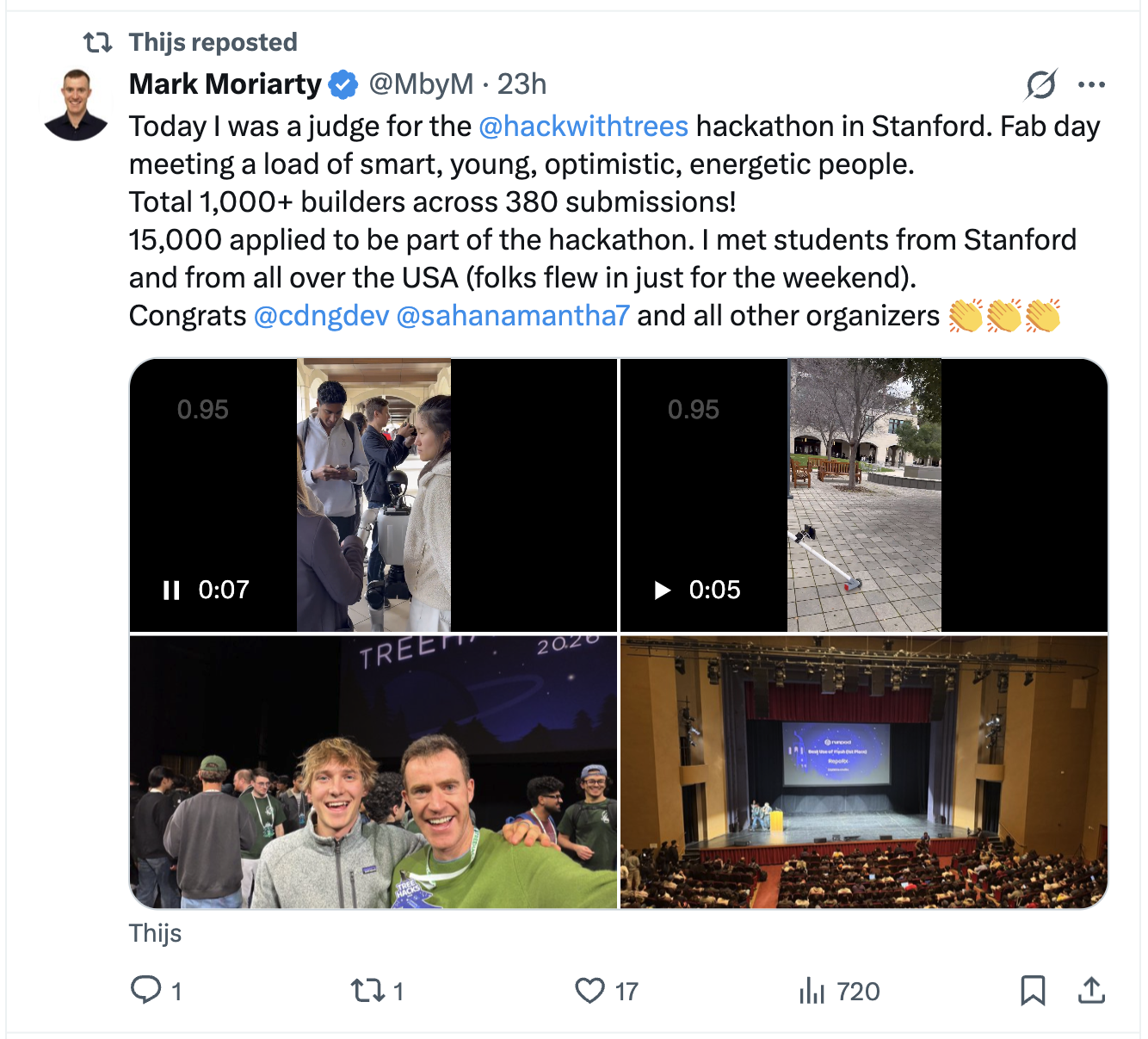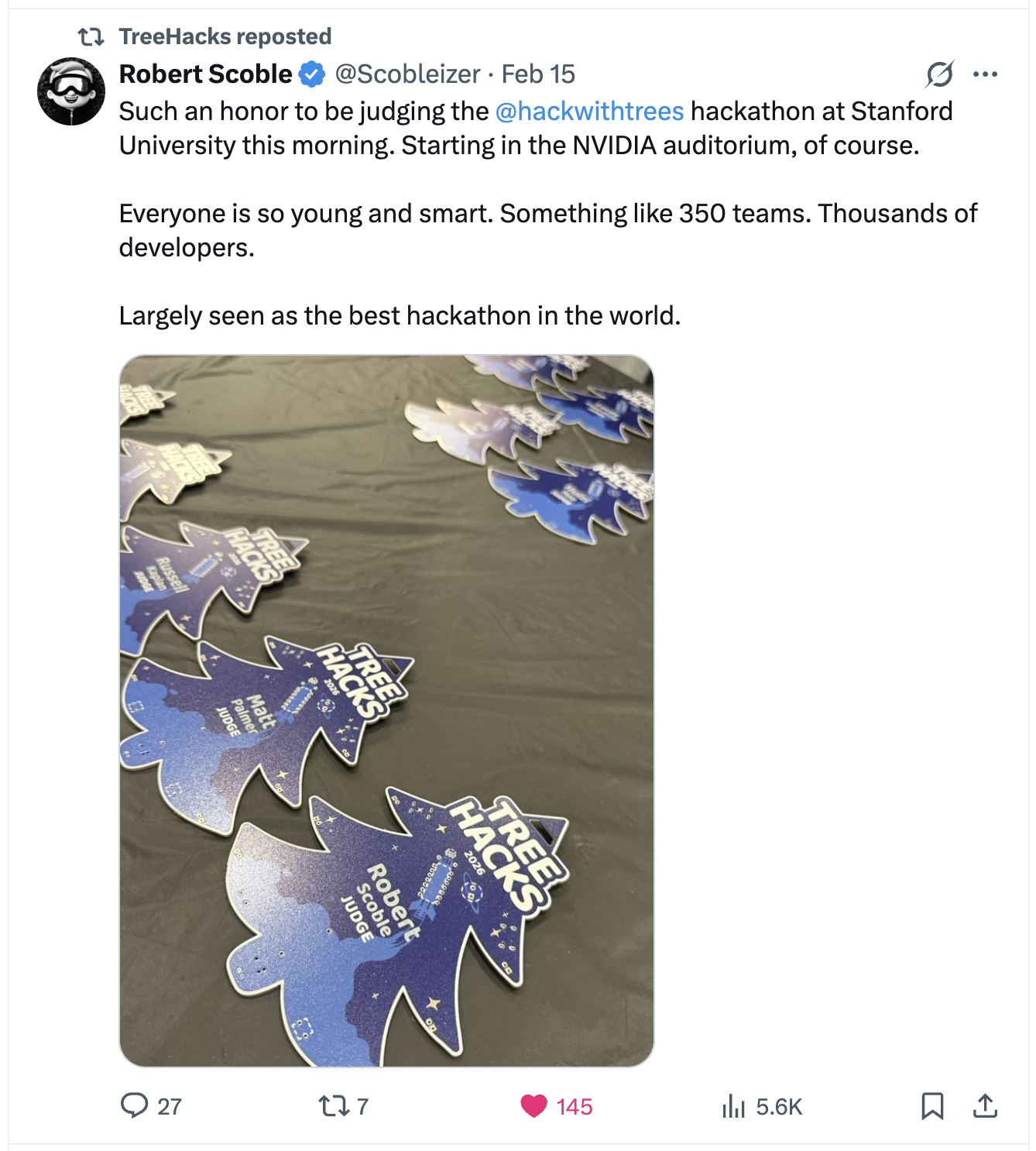- https://x.com/hackwithtrees This is an extremely selective and prestigious hackathon. Over a thousand attendees will compete for over $500,000 worth of prizes. This year’s speakers and judges included Sam Altman (CEO of OpenAI, the creator of ChatGPT), Garry Tan (CEO of YCombinator) and Mark Moriarty.